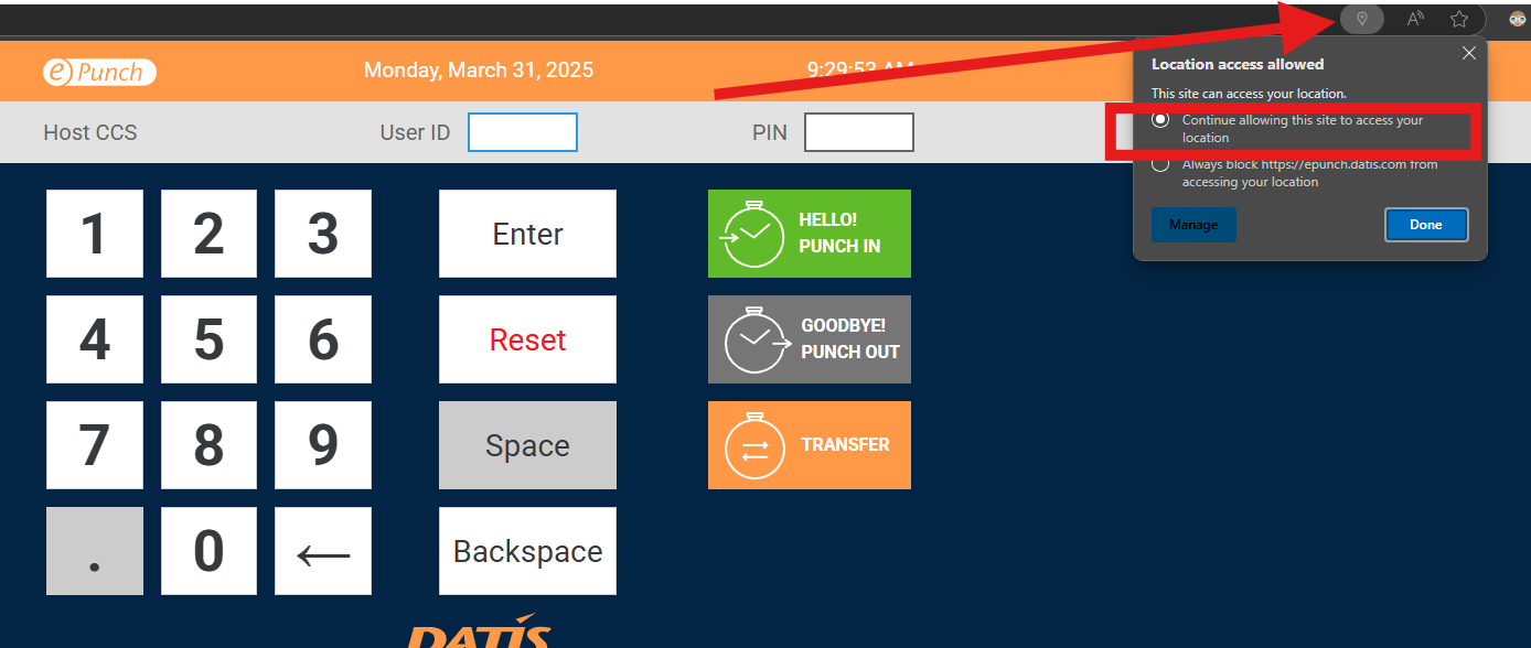 To punch in you will need to enter your Host, User ID, and Pin. You will have to do this each time you punch in and punch out or transfer to another position.