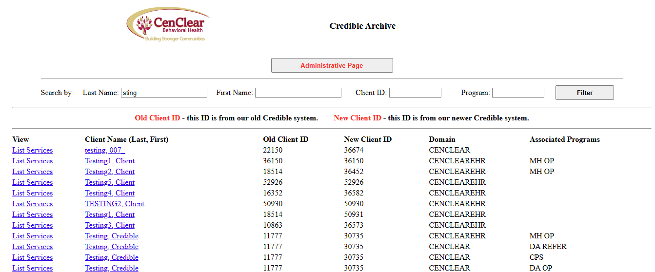 Please note that services are separated by program as well as by era (CENCLEAR, CENCLEAREHR). The rows marked CENCLEAR will have data from Credible up to the end of 2018, whilst the CENCLEAREHR rows will have data after the end of 2018.